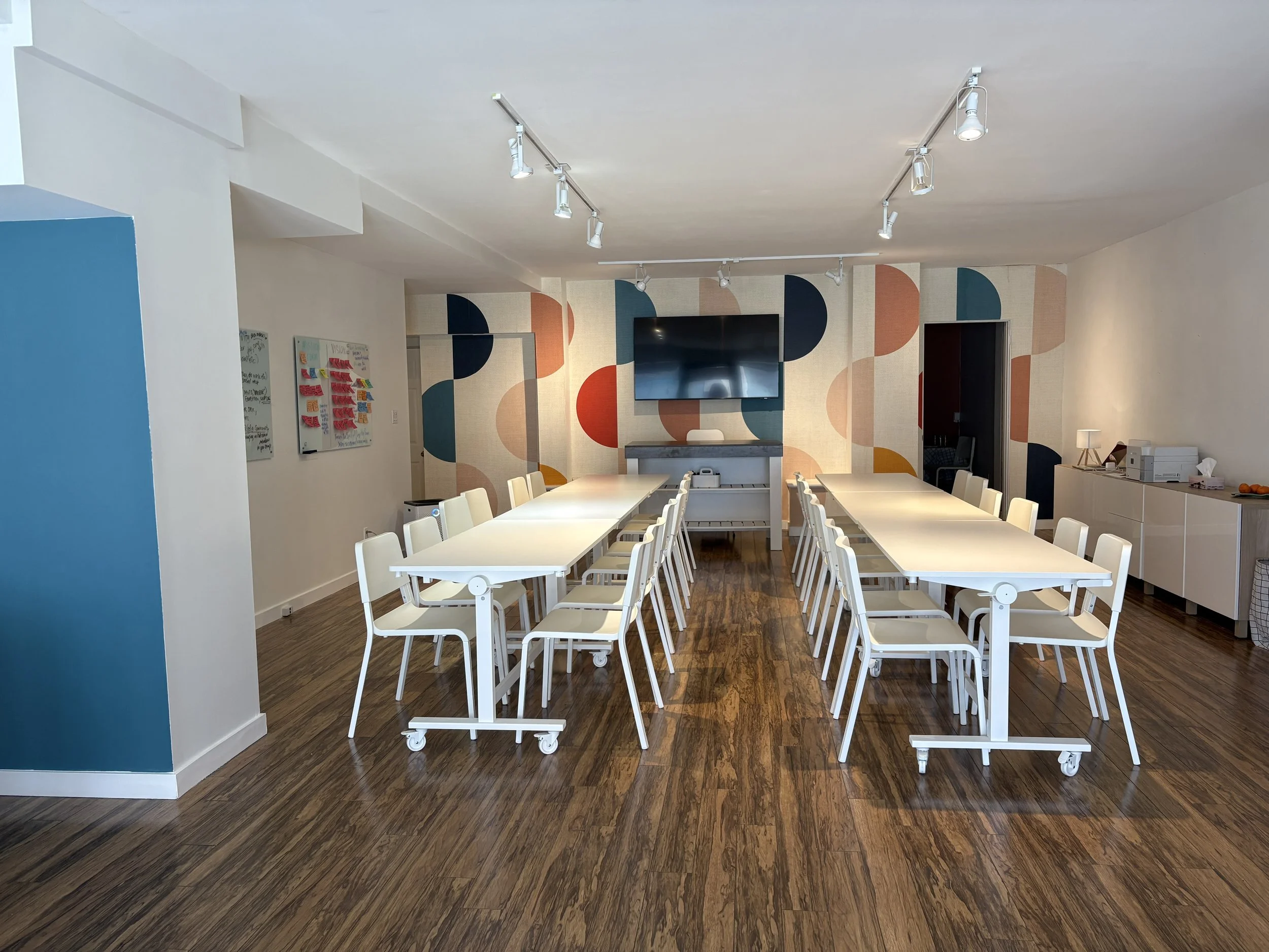 Whiteboards provide space to visualize your ideas and a 65” monitor is easily accessed for presenting a deck or reviewing digital elements as a team. A dedicated breakout space lets quieter conversations go deep without leaving the room. The kitchenette is ready to go with coffee and tea and includes a fridge for storing any snacks you bring along. External catering is welcome and we’re happy to provide some suggestions if needed.